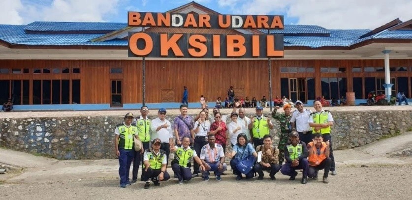 Maria Kristi di antara personel di Bandara Oksibil di Papua.