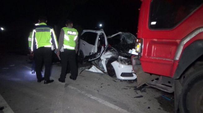 Petugas kepolisian melakukan pengamanan terhadap mobil yang menabrak truk tronton parkir di Kota Ngawi, Kamis (12/1/2023). foto: dokumen satlantas polres ngawi